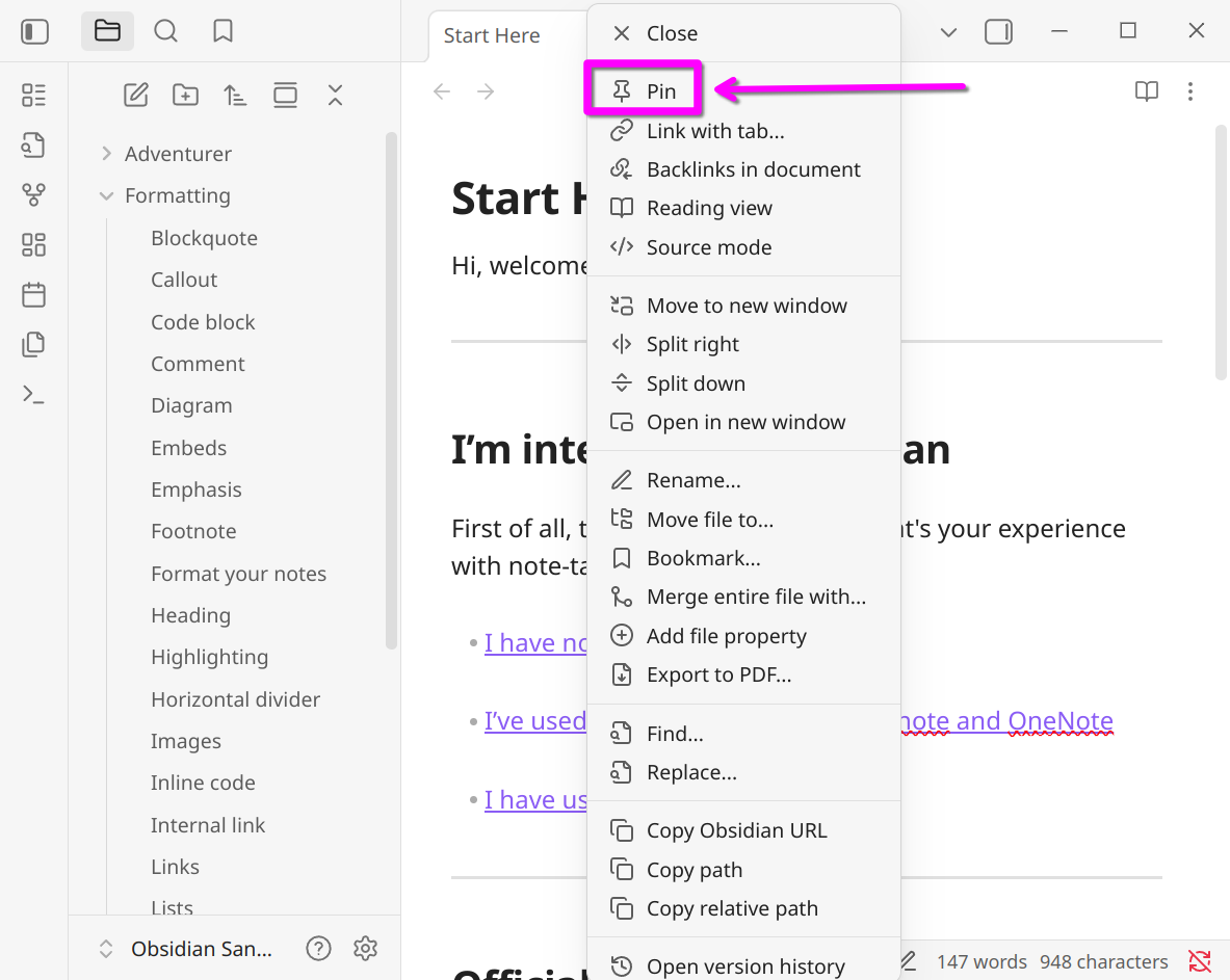 In previous versions of Obsidian, there was a “Pin tab” option available when right-clicking on a tab.
