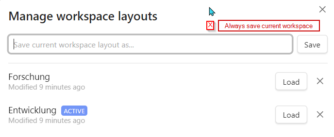 Currently if you click “Save” in the layout manager when there’s nothing in the text box, it gives an error message. Why not simply have it save to the current layout, the one marked “ACTIVE”? And then if I need to load a different workspace, I’m already there in the manager.
