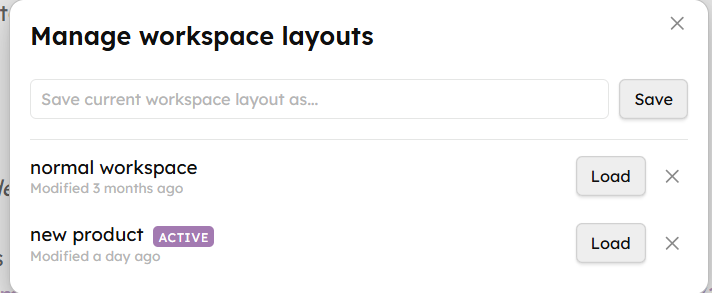 I click the “manage workspace layouts” icon on the ribbon menu. I see a list of the 6-8 different workspaces I juggle, with an “ACTIVE” indicator on one of them. Each one tells me the last time it was modified - minutes, hours, or days ago. There’s also a text box and a “Save” button in case I want to save the current layout under a new name.