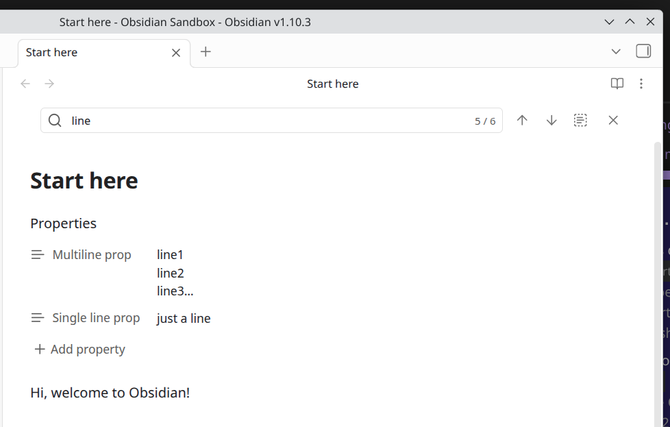 However, for some reason, Obsidian does not put that <span> around matched text inside the properties when in live preview. Since the text is not marked, this cannot be remedied via css.