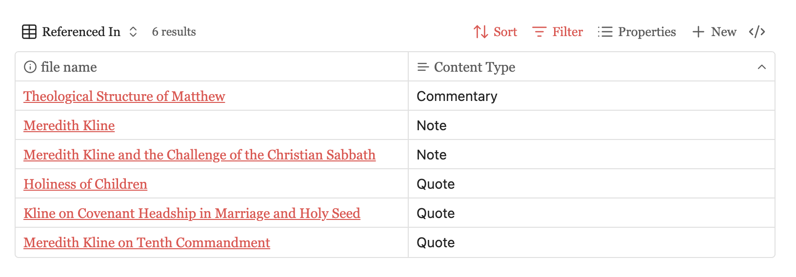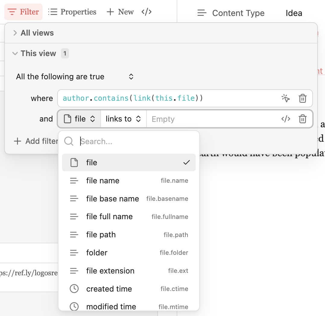 Glad to clarify. Bases can only find content based on file information or properties. Let’s say you have notes that reference a particular author (e.g., Meredith Kline) but didn’t link Kline in the note when writing. The only way Bases could surface that content right now is if you include Meredith Kline somewhere in the frontmatter or file information (e.g., file name).