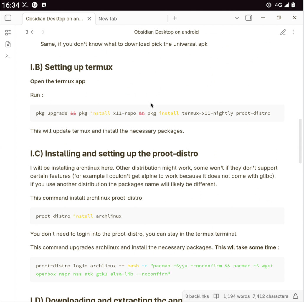 For technical reasons, it is not possible to run obsidian directly in the termux distribution. We have to set up a more classic linux distribution inside termux using an utility called proot.