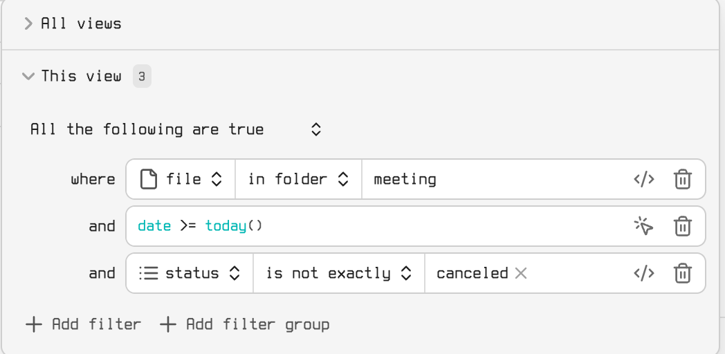 In this example it might be useful to show all meetings for the current day. But most often I just want to create a specific base view note.