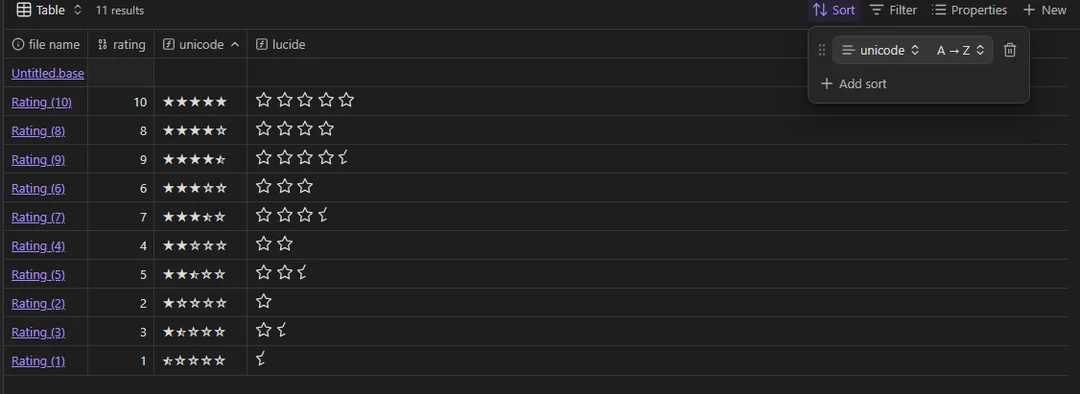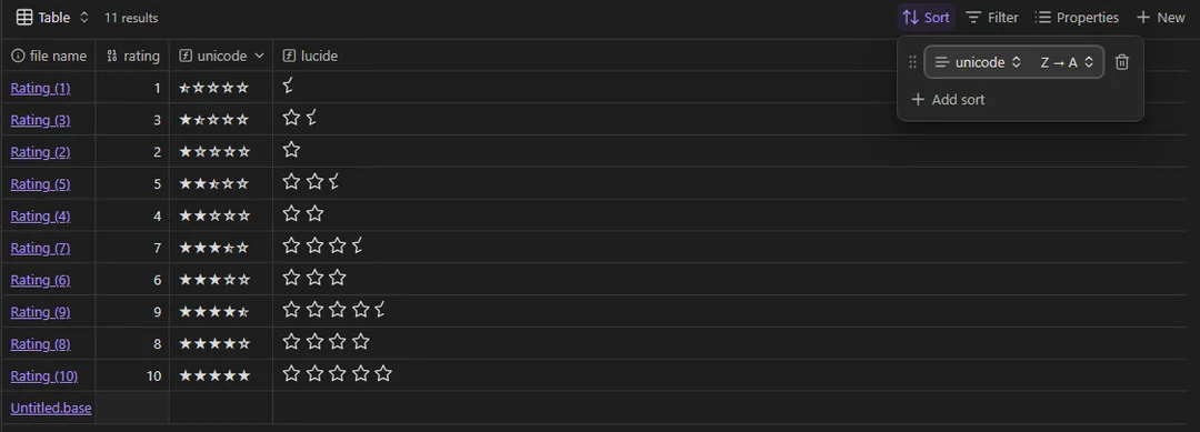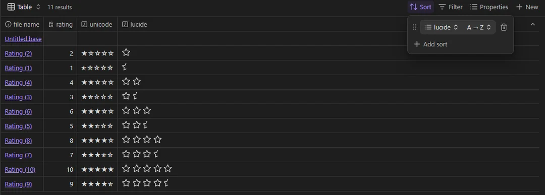 Using Unicode or Lucide icons and try to sort them in bases, tested with stars and half starsDid you follow the troubleshooting guide? [Y/N]