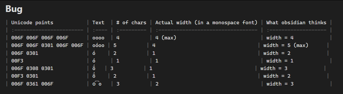 | Unicode points | Text | # of chars | Actual width (in a monospace font) | What obsidian thinks | | :----------------------- | :--- | :--------- | :--------------------------------- | :------------------- | | 006F 006F 006F 006F | oooo | 4 | 4 (max) | width = 4 | | 006F 006F 0301 006F 006F | oóoo | 5 | 4 | width = 5 (max) | | 006F 0301 | ó | 2 | 1 | width = 2 | | 00F3 | ó | 1 | 1 | width = 1 | | 006F 0308 0301 | ö́ | 3 | 1 | width = 3 | | 00F3 0301 | ö́ | 2 | 1 | width = 2 | | 006F 0361 006F | o͡o | 3 | 2 | width = 3 | -