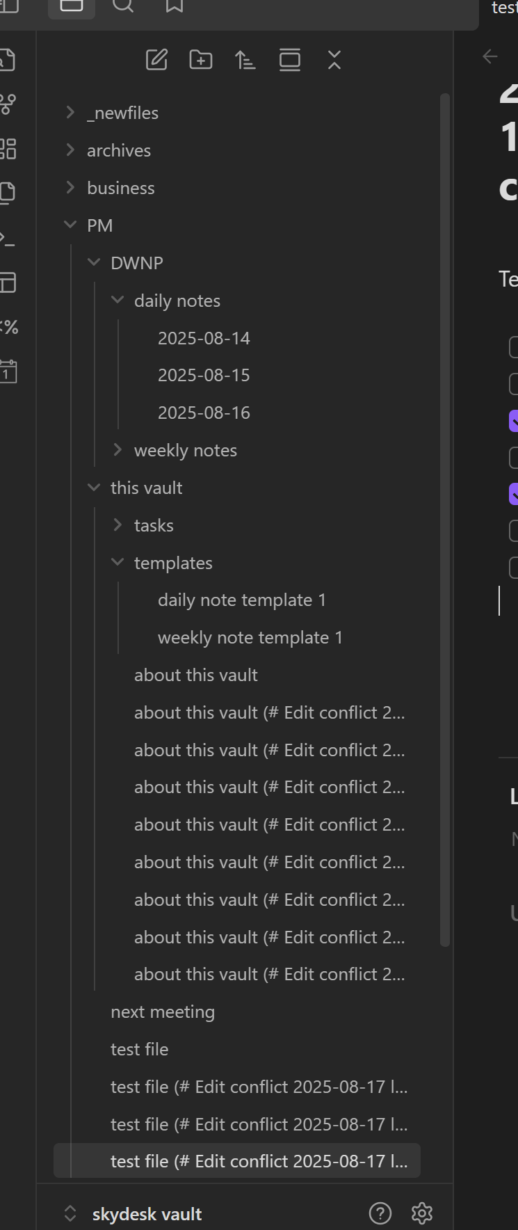 I get multiple versions of different files - for example, the file “test file.md” is replicated, unchanged, with new filenames like: