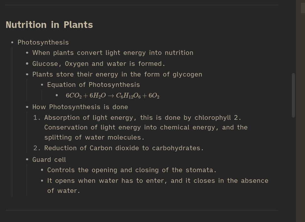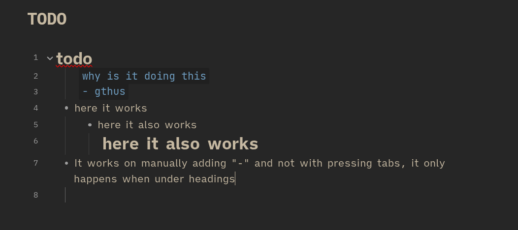 The difference between your 2 screenshots is that in the 1st one you have a heading (todo) directly followed by a simple piece of text (turned into a code block as it’s indented) while in the 2nd screenshot, you still have a heading (Nutrition in Plants) followed by a list in which you have various items and subitems (which where indented using either Tab or a certain amount of spaces)