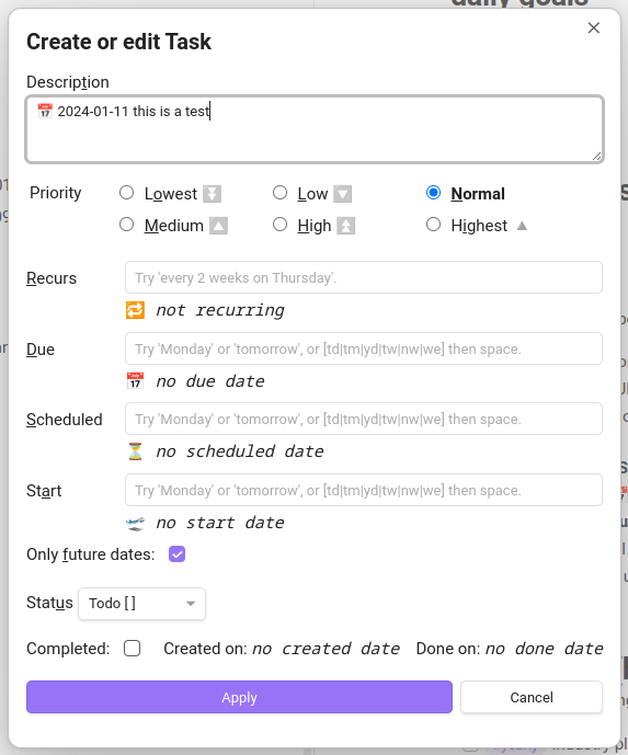 Now here’s the issue. The tasks plugin will only recognize the task priority of the emoji is placed AFTER the task description. Notice how all my tasks have been grouped as “normal priority”, and how the priority emoji is recognized as part of the description.