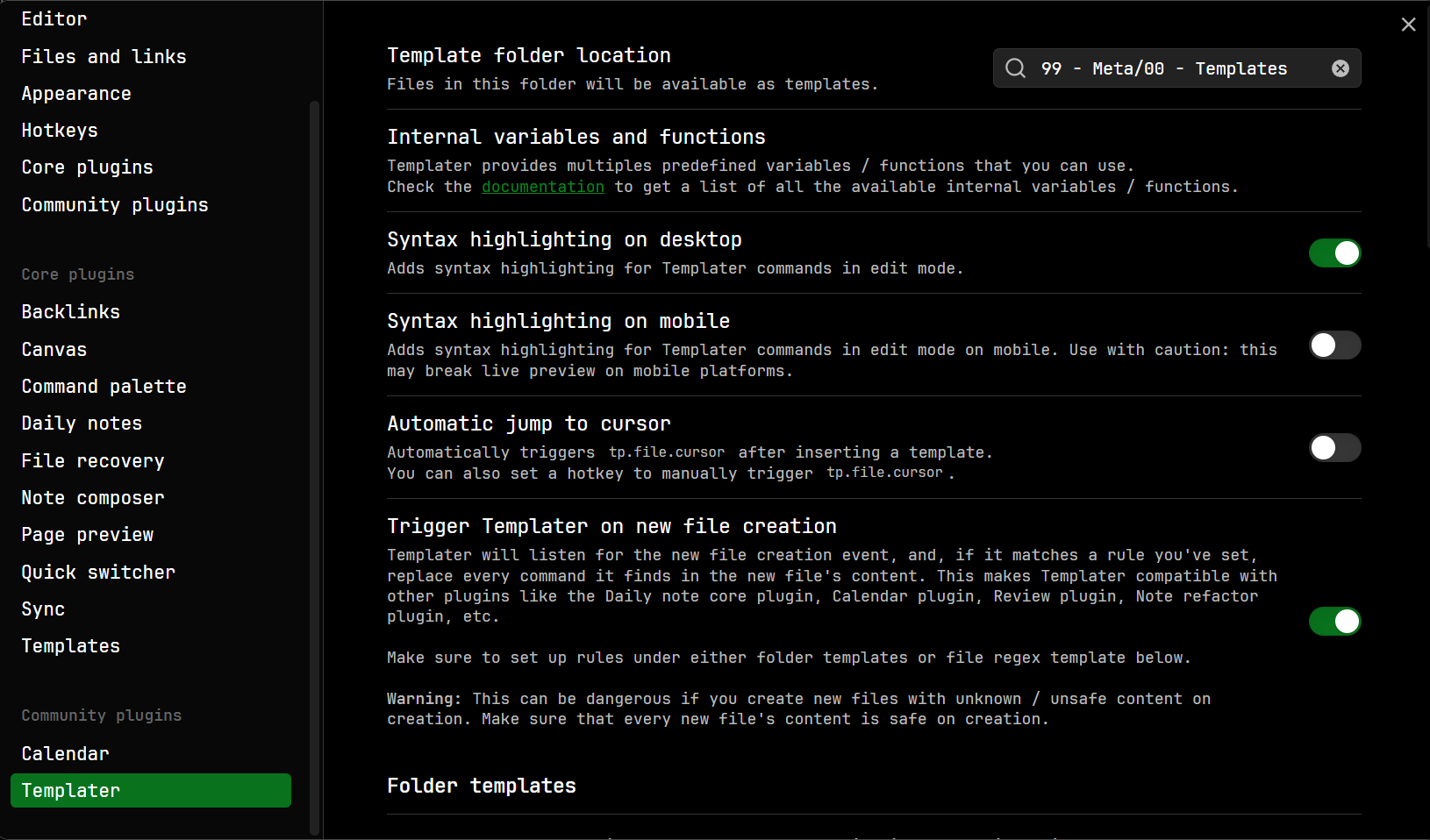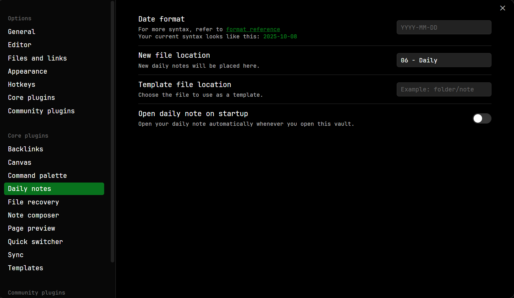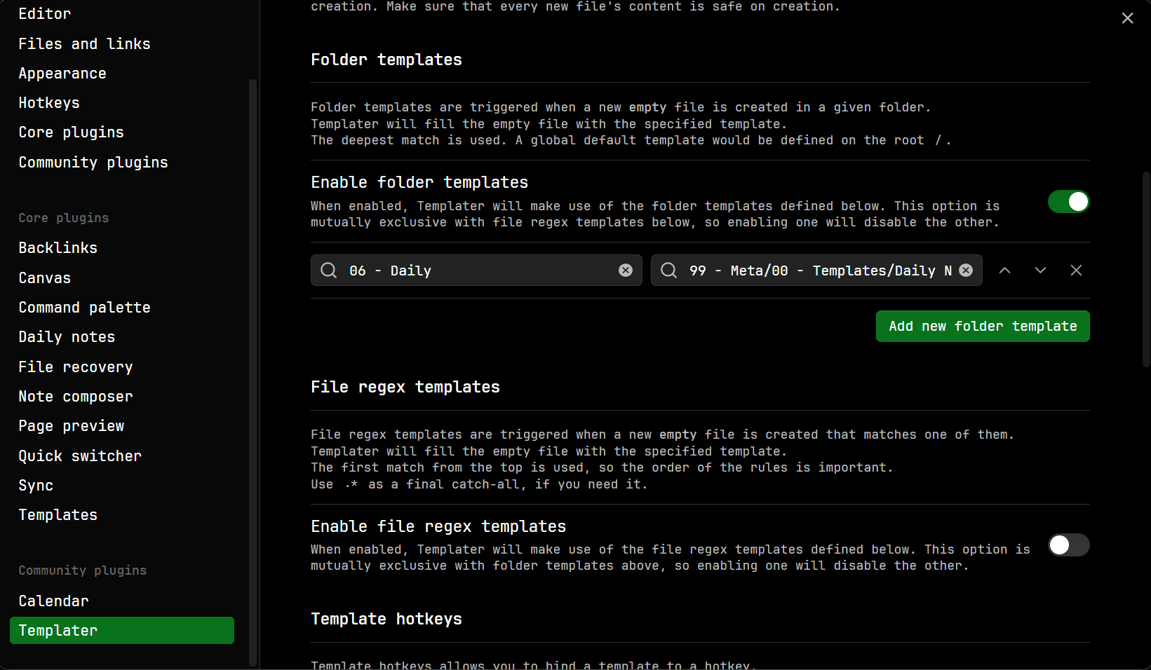 Following up, here is my template for the daily note as well as my settings I have for templater and daily notes