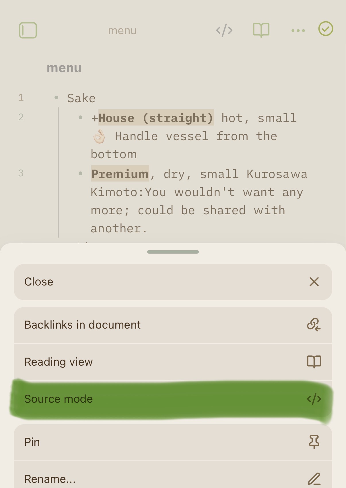 I’m very new to Obsidian, so it took me awhile to realize that your demonstration was apparently edited in Source Mode which, as far as I can tell, is not available to me in my Android app, where I spend 99+% of my time viewing and editing my entries; I sync to my Mac as a backup. Unfortunately/Understandably, screen space is a premium for me and couching something like “appetizers” with two empty lines is unappealing. I would consider just bulleting “appetizers”, except the Android app appears to have a bug (second image, from my Mac app, is fine).