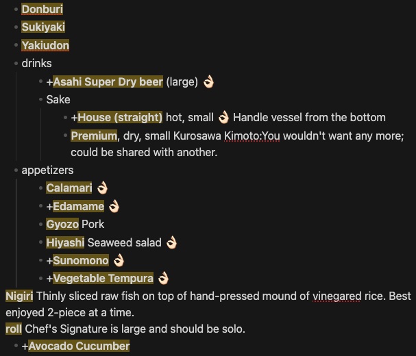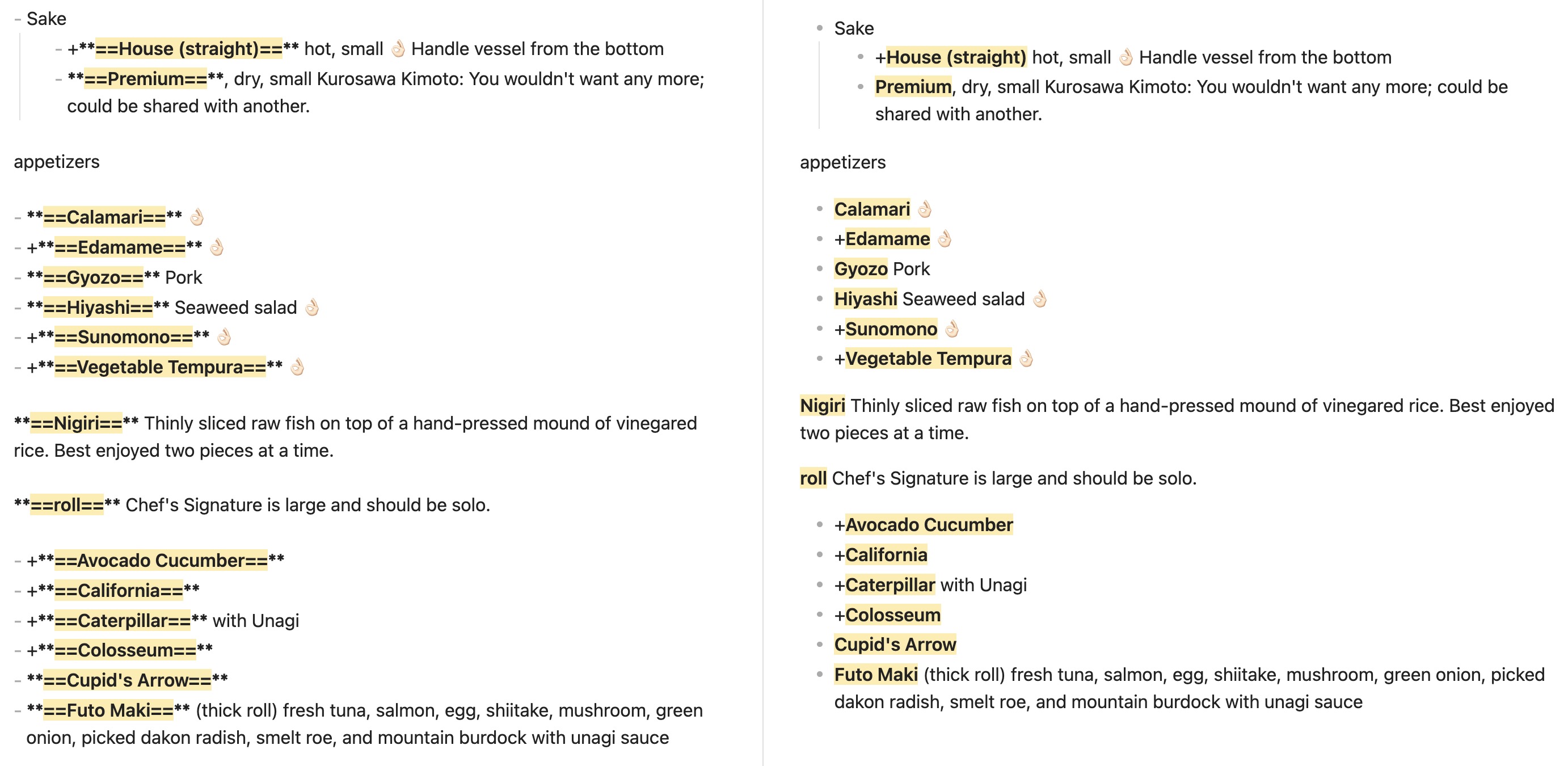 I can’t see anything unexpected in your sample text. Are you referring to the alignment of the lines that start with ‘appetizers’, ’Nigiri’, and ‘roll’ being different in editing and reading modes? If yes, that’s because the editing text has not been parsed. The parsed version is normal / correct. You can align those lines to the left with correct Markdown spacing – see below.