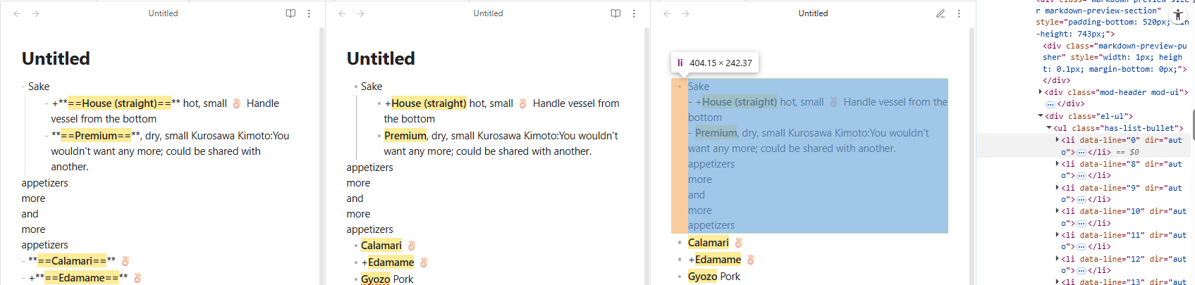 Scratch that. I had my Mac in Reading mode. When I switched it to Edit mode it has the same odd bullet behavior within “drinks” and “appetizers” (illustrated by my first image). Sorry for the confusion, but Obsidian is not very intuitived for “just a user”. And it doesn’t help that the Android and Mac apps don’t compliment each other.