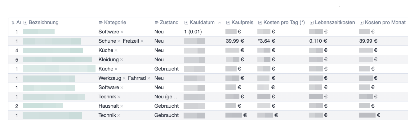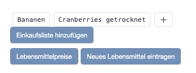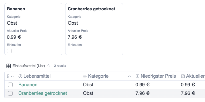 Next, I have a button that runs a Templater script. The script reads the grocery list from the property, sets the Einkaufen property to true in the respective grocery notes, and then resets the list property. I can then display all groceries I want to buy in a base using a filter on the Einkaufen property.