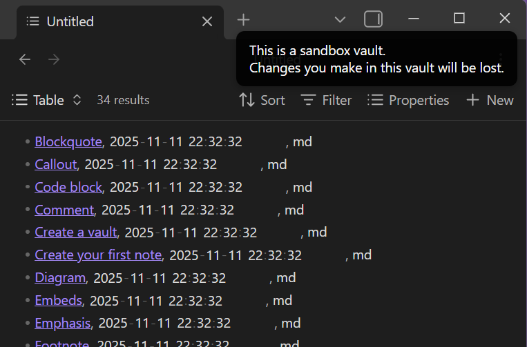 In the sandbox, create a base. Display any date property (created time in the example below) and any other property (file extension). Change to the list view.