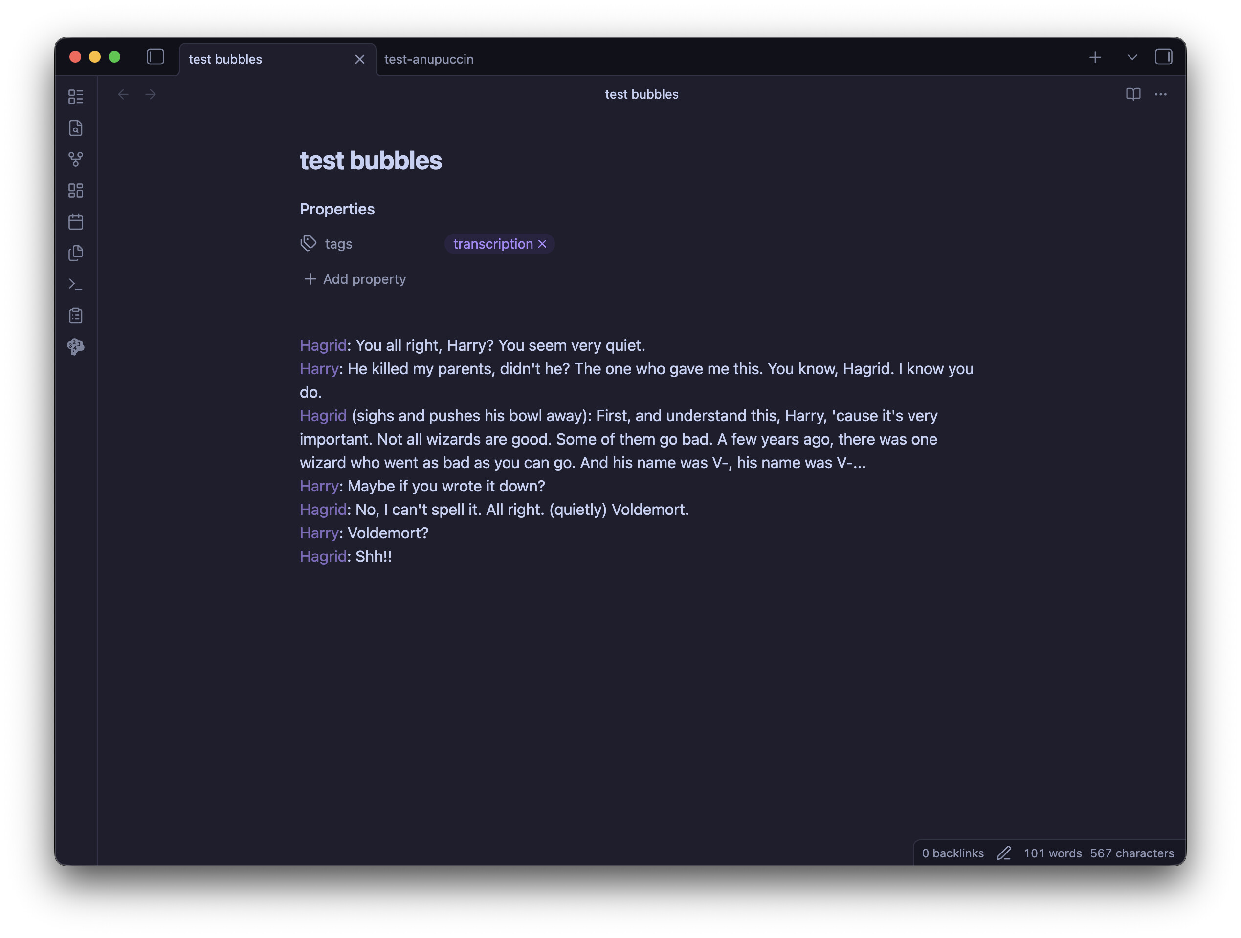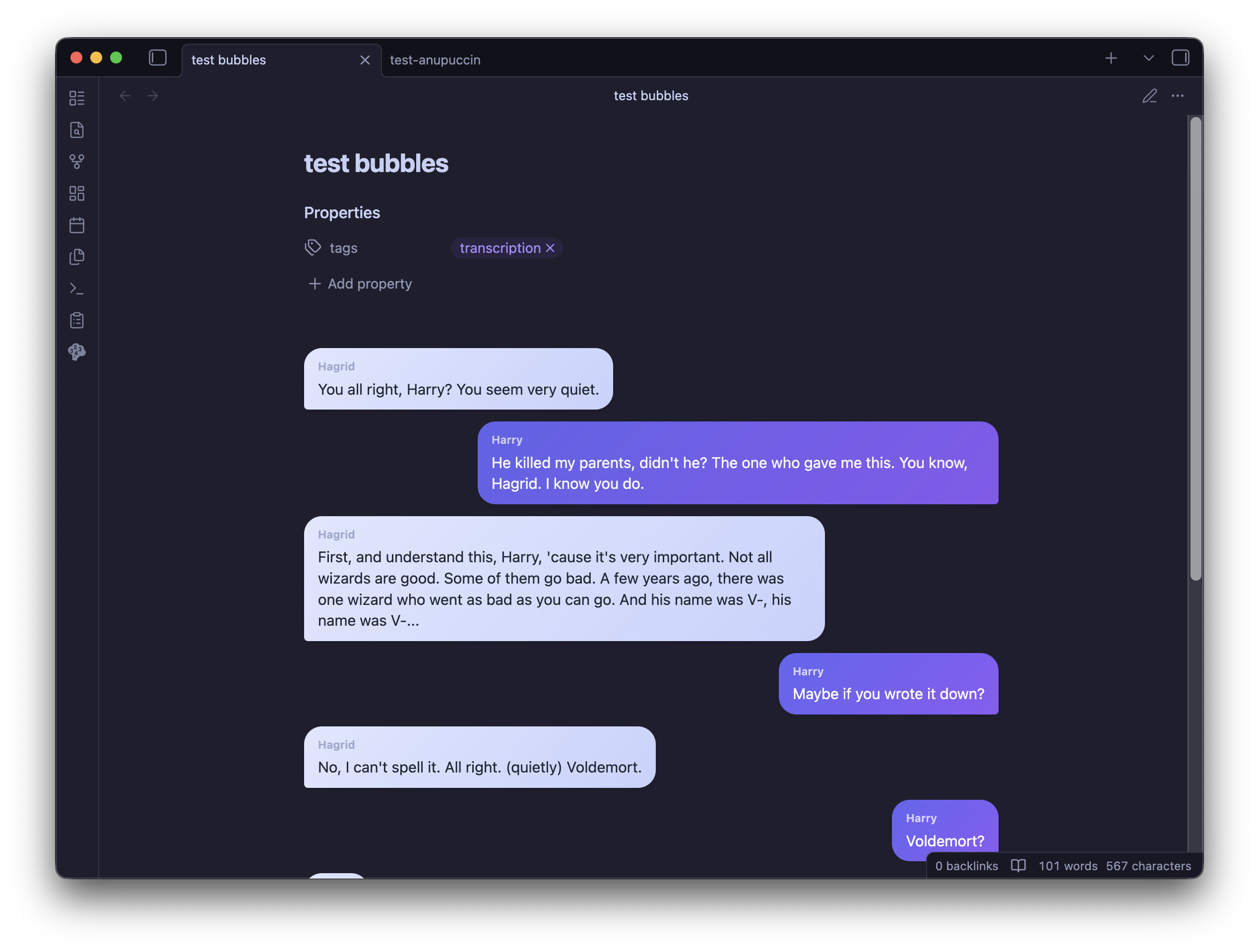 I built a plugin for myself that turns transcripts into chat-like speech bubbles in “Reading view”. So I was wondering whether it could be useful for someone else, and what kind of features would you like to see there. Here’s how it looks now in editing/reading mode.