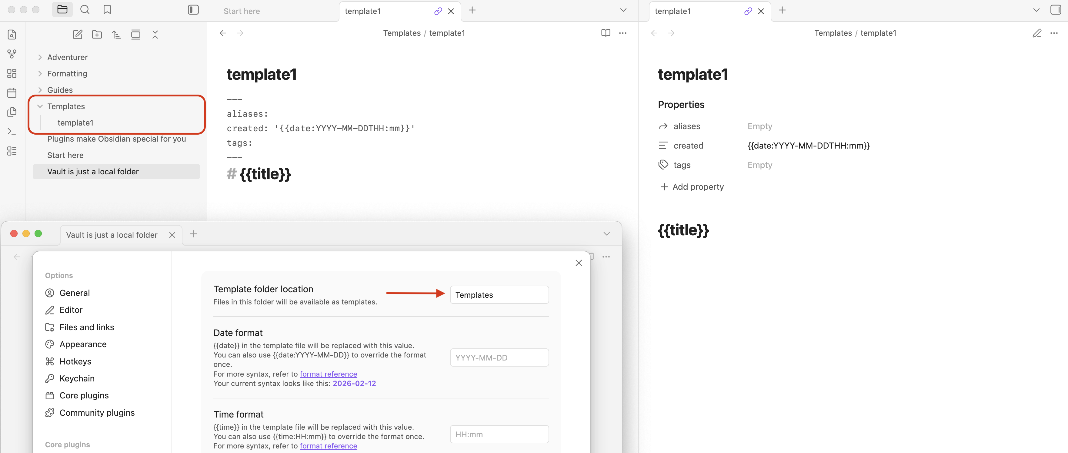source mode, reading view, and the Templates settings below.