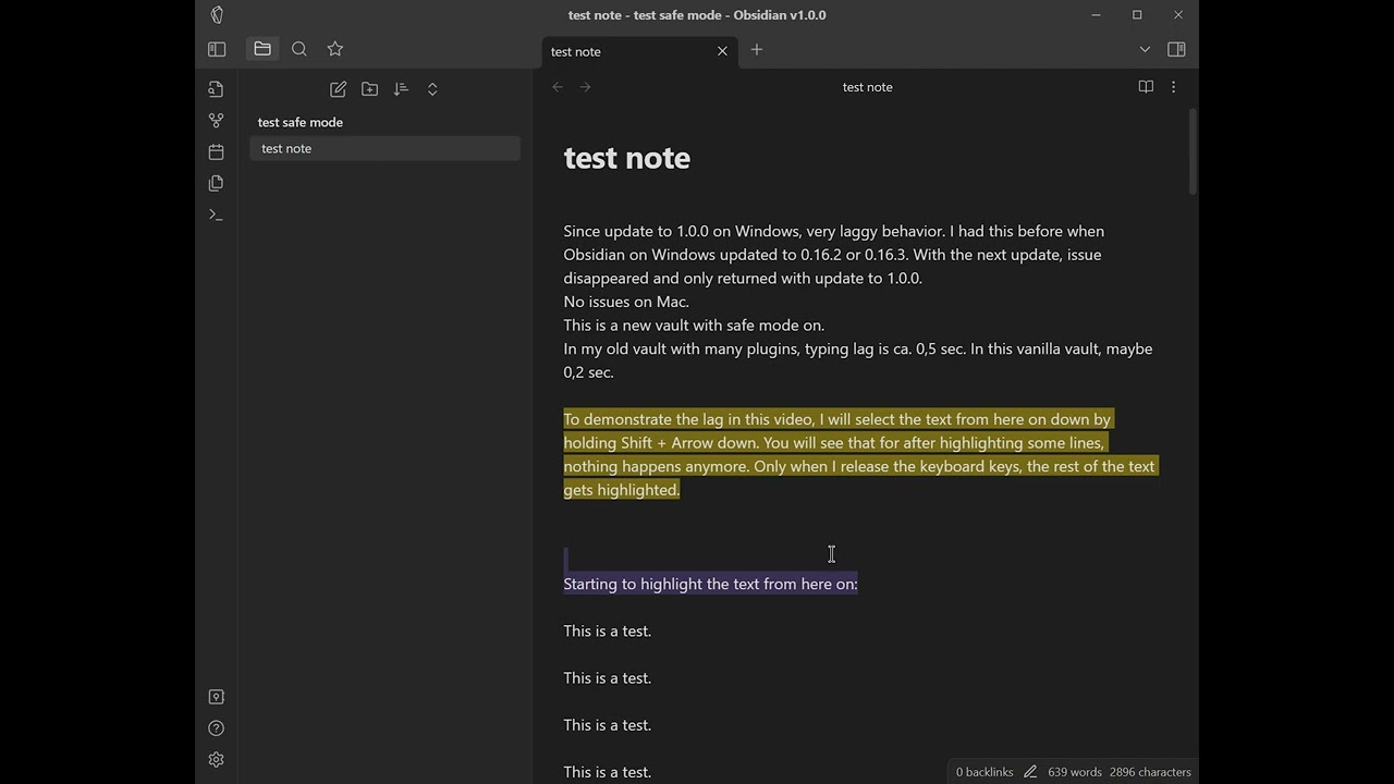 To demonstrate the lag in this video, I selected text by holding Shift + Arrow down. You will see that for after highlighting some lines, nothing happens anymore. Only when I released the keyboard keys, the rest of the text got highlighted.