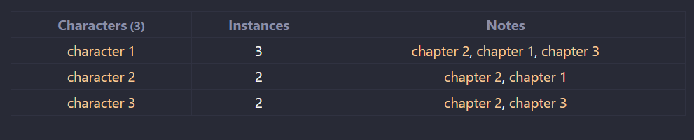 For instance here, I am trying to grab all characters that appear in this arc (collection of chapters) and showcase how many chapters they appear in in comparison with each other. So “character 1” would show up as a bar that counts to 3, “character 2” and “character 3” would each show up on bars that count to 2. Is this kind of thing possible?? It feels like it shouldn’t be that hard.