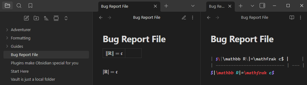 Write $|\mathbb R|= \mathfrak c$ once inside a paragraph and once inside a table cell.