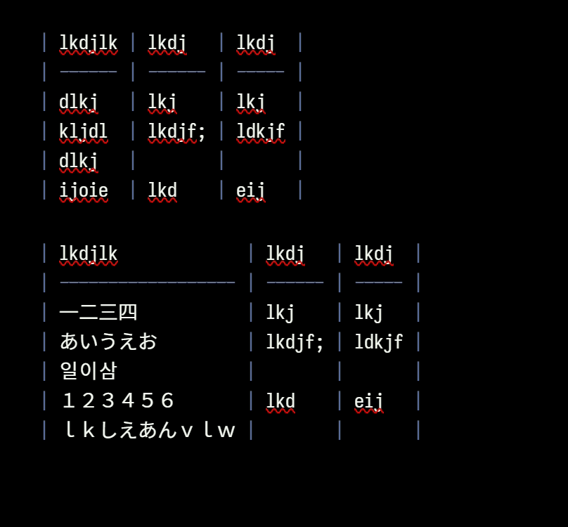 Note: With a proper monospace font that supports CJK characters, CJK characters would be “full-width”, and Latin characters would be “half-width”. If you have such font installed, the table above should be lined up beautifully.
