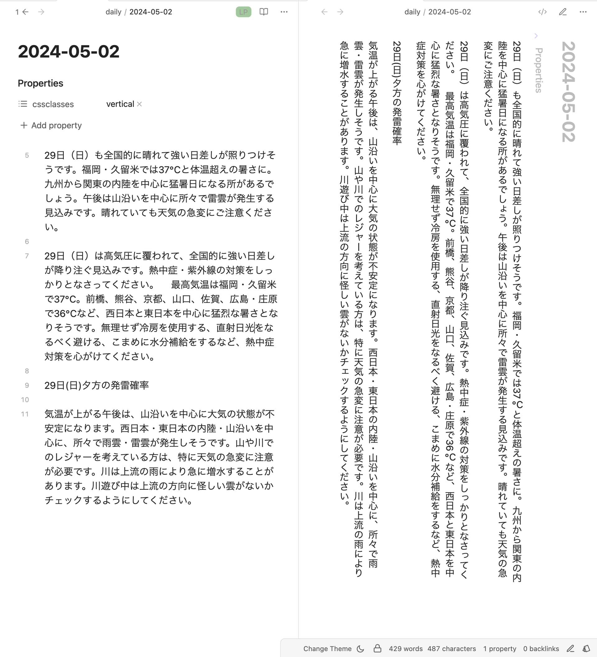 In edit mode, the text is vertical and right to left but it starts in the top left corner. In view mode it is correctly in the top right corner but the line wraps very far from the bottom of the page.