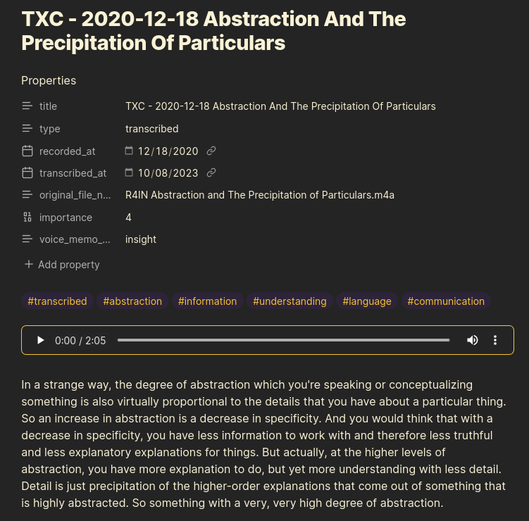 The convenience of voice notes is amazing - their lack of organisation and searchability is NOT. Wouldn’t it be amazing if you could create a voice memo, and have it automatically transcribed into your Obsidian vault in markdown, along with pertinent tags, categorization and metadata properties?