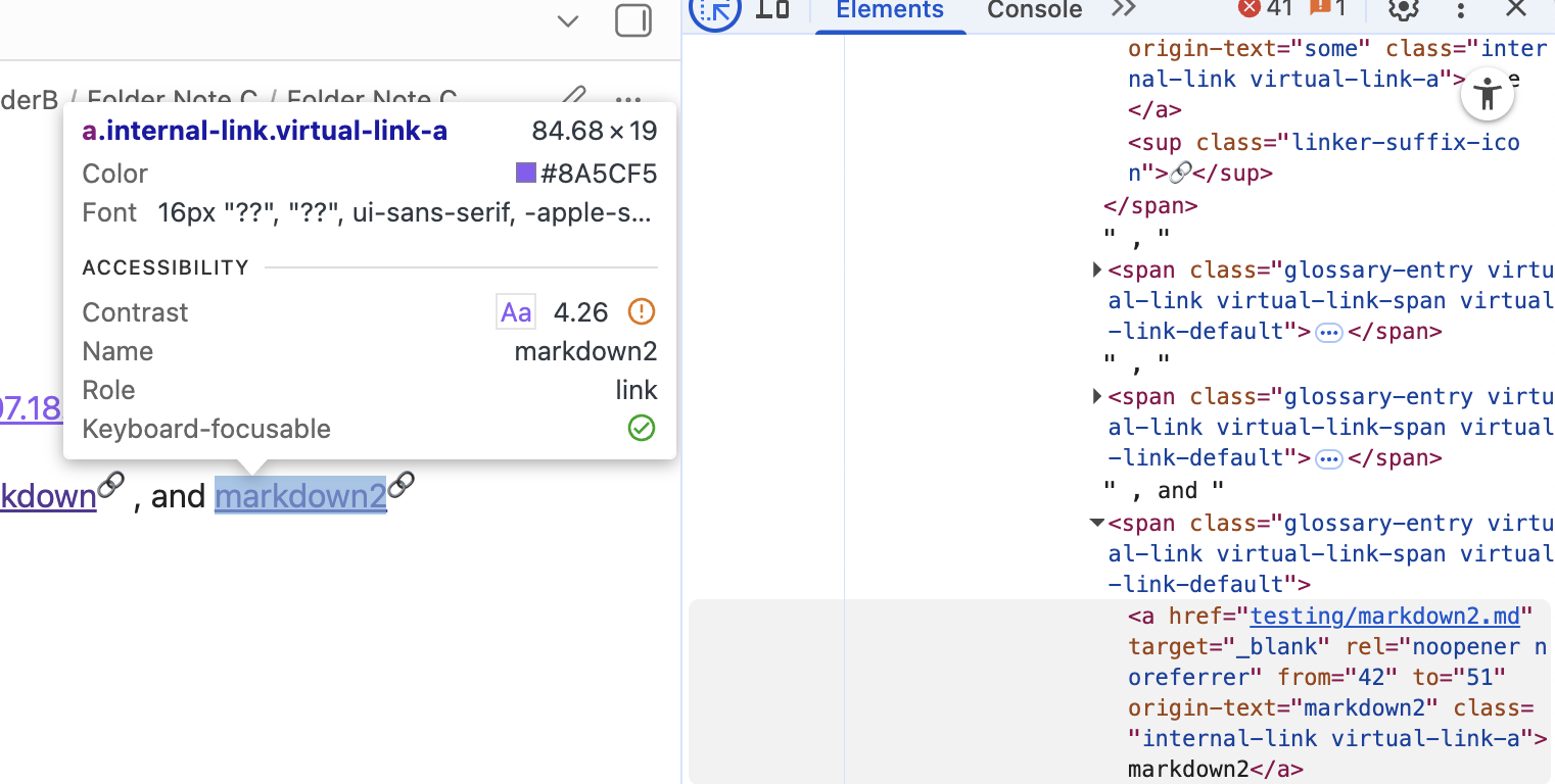 Hi. The Virtual linker plugin has a suggestion to change the appearance of its links. I am trying to change the colour so that they are differentiated from other links. The plugin itself says that it is possible to do this by “affecting the class ‘virtual-link’, but doesn’t have any other instructions. It doesn’t matter what the colour is, as long as its in hexadecimal code (so I can easily edit it), but I can’t figure out how to change it at all. I have tried to use obsidian-css-snippets/Snippets/Links.md at master · Dmytro-Shulha/obsidian-css-snippets · GitHub as a guide, but none of the formats worked, the way I applied them. I’ve given one example of an attempt below: