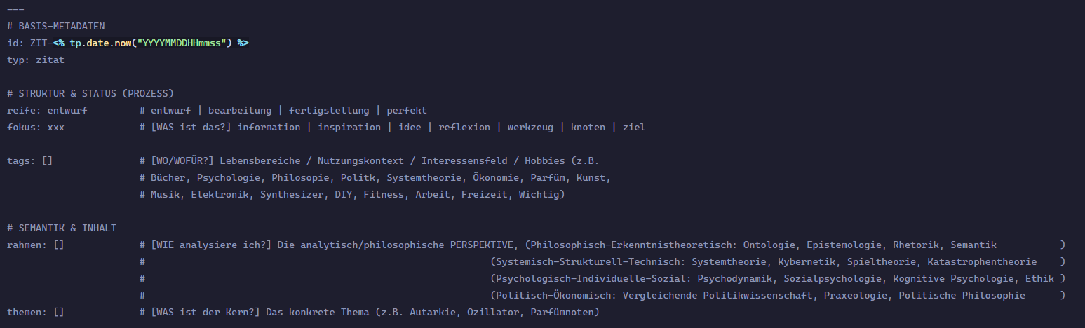 Ive been working on this template for quotes for some time now and have had no problems with it. Im trying to “view” my notes all through what one could call a specific lens, as in a certain framework. Im trying to do the tagging just right. So Ive commented out exactly what classifies as a tag, what classifies as a theme, what classifies as a frame etc. to not get these mixed up or have any doubts about it, I commented the proporties out with a # to have some explanation next to it. This has worked perfectly fine for the past 2 weeks or so.
